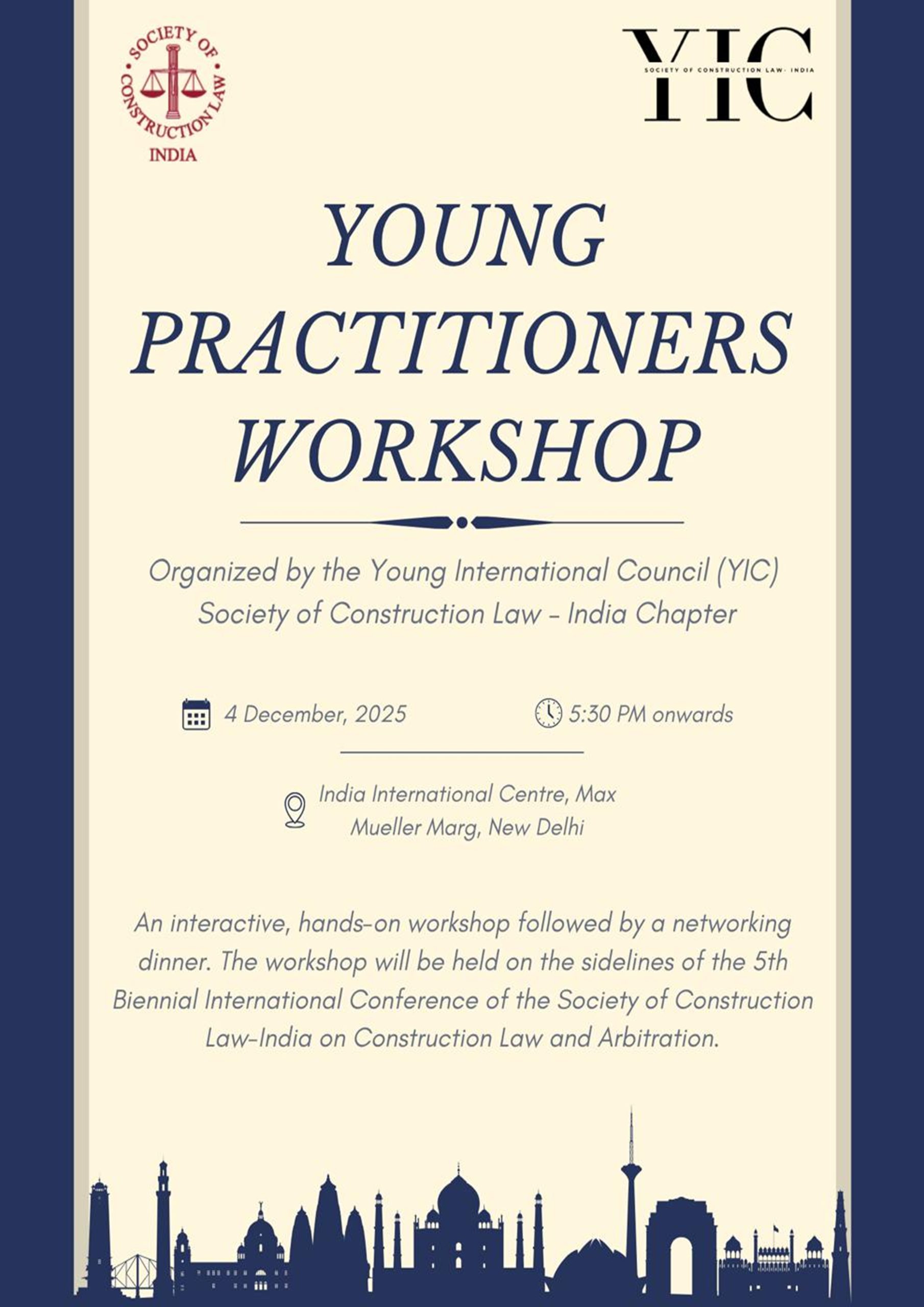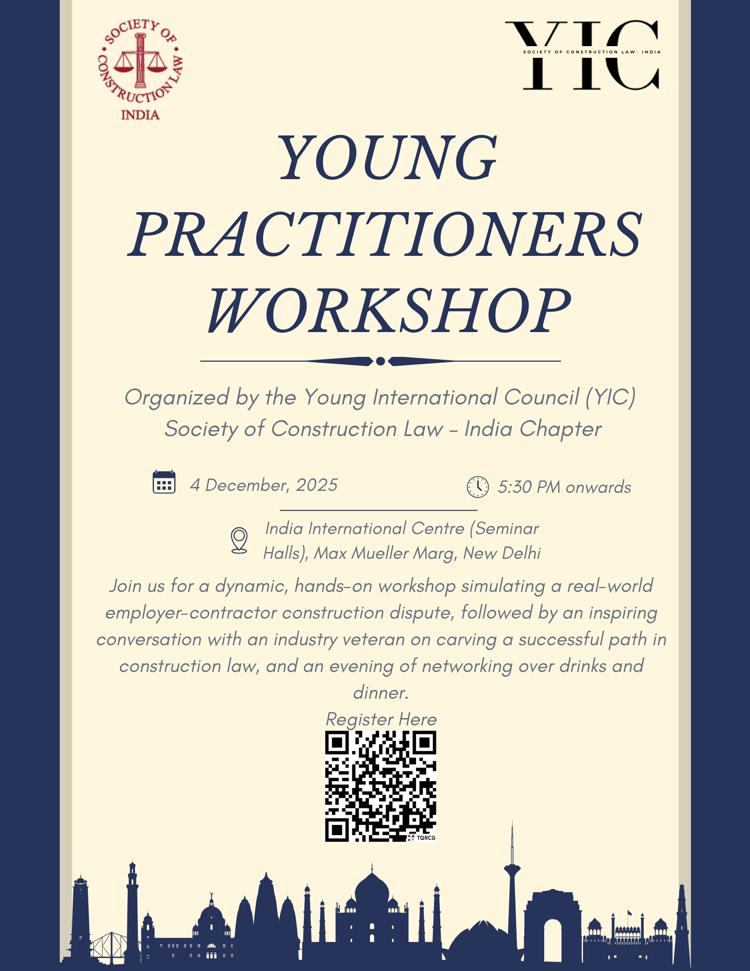The Young International Council (YIC) of the Society of Construction Law, India Chapter is pleased to invite interested practitioners to a focused, interactive workshop on Indian construction delay disputes followed by a networking dinner. The workshop will be held on the sidelines of the 5th Biennial International Conference of the Society of Construction Law-India on Construction Law and Arbitration.